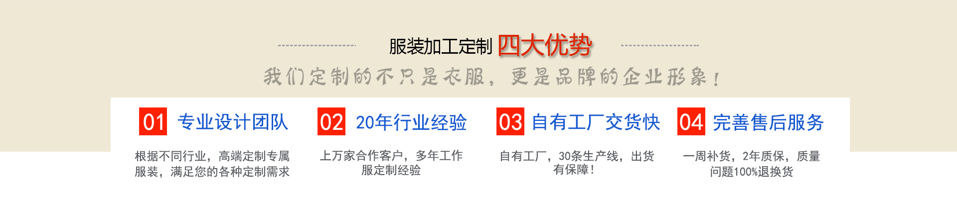 服裝加工網是一家及設計、生產、銷售為一體的專業(yè)服裝生產型企業(yè), 根據客戶需求定制西服襯衫工作服大衣棉服等產品,近二十年工作服職業(yè)裝定做經驗積累, 工期短交貨及時,免費提供團體定制上門量體服務,送貨上門,免費修改,完善的售后服務, 滿足您的各種定制需求!